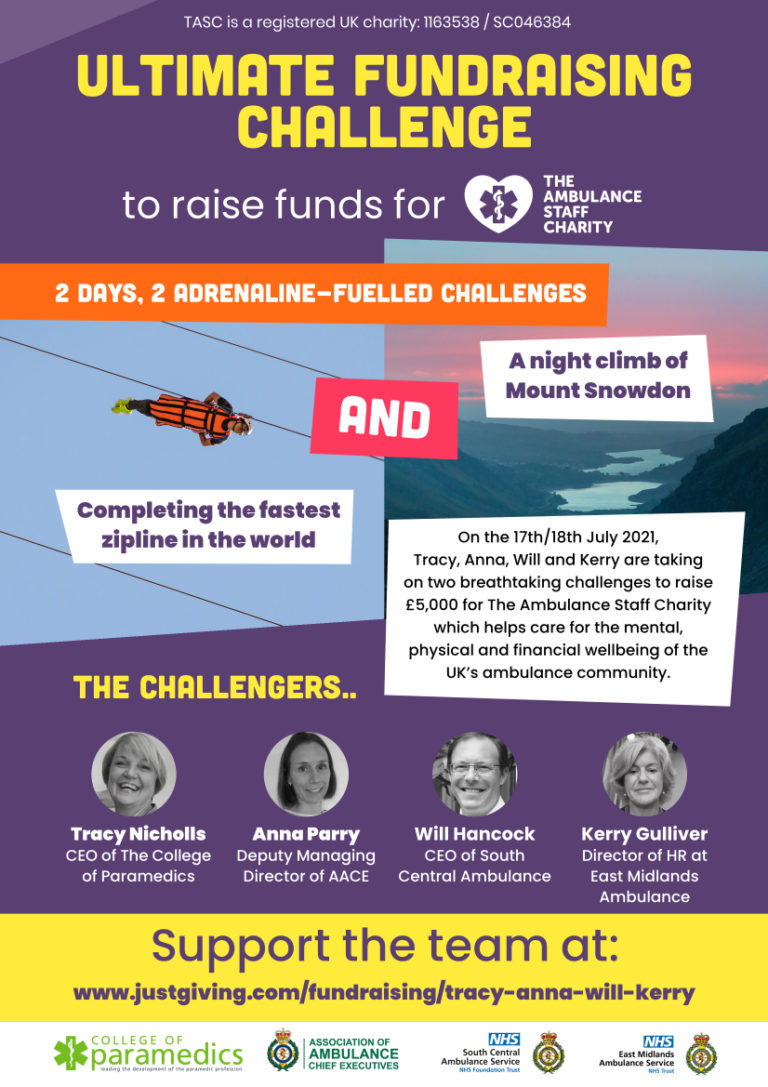 Tracy, who is the CEO of the College of Paramedics, Anna, who is the Deputy Managing Director of AACE, Kerry, the Director of Human Resources and Organisational Development at East Midlands Ambulance Service and Will, the CEO of South Central Ambulance Service have decided to team up to raise £5,000 for TASC which helps care for the mental, physical and financial wellbeing of the UK’s ambulance community.